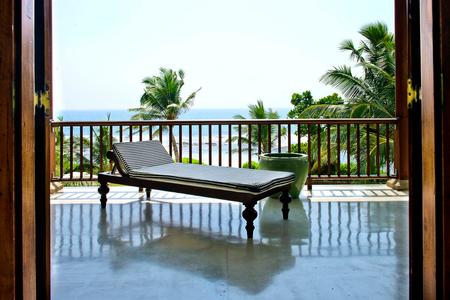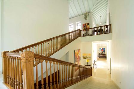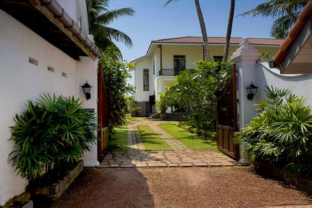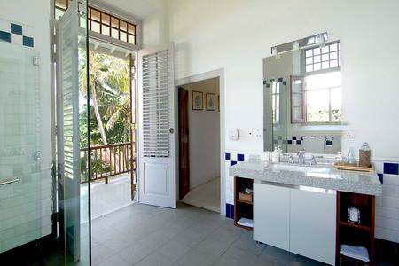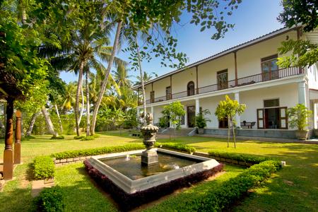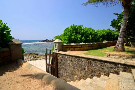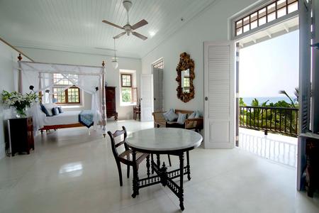 About 20 mins down the coast from the UNESCO world heritage Galle Fort, the villa sits on a small promontory. Entering the gate the magnificent house is displayed for you across a lawn that has a small ornate water feature. It is a two story house with a grand entrance, and hallway, centrally located. The kitchen to the right is modern and spacious and the TV/music/dvd room with soft sofas is to the left. All five bedrooms are on the first floor and accessed from a ‘square shaped’ covered balcony that on one side has the bedrooms and on the other has an open sky view providing light and air. The master suite and second bedroom - both doubles - have covered terraces overlooking the garden and out to sea.