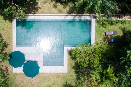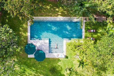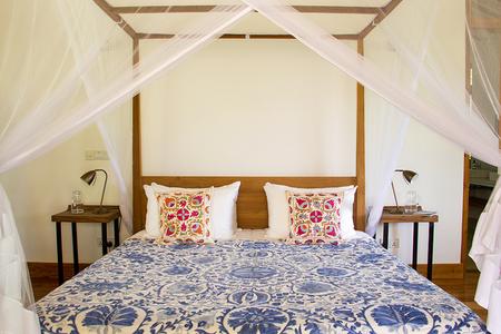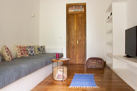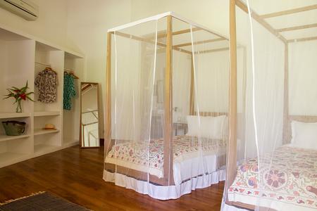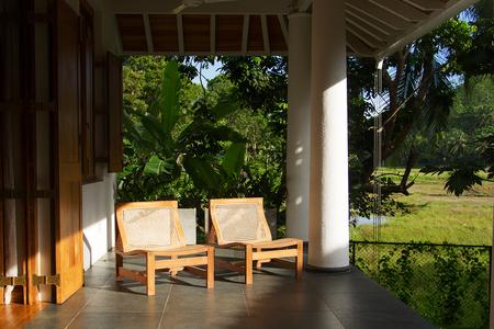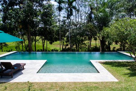 The second building houses the main bedroom and a twin and also has a wide verandah elevated above the lawn with views across the pool towards the surrounding rice fields.