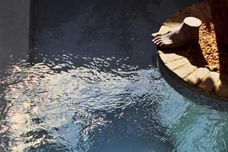 You enter the house via a large high ceiling hall with a mezzanine floor to one side supporting the study and TV/DVD. Through either one of two arches you arrive at the open plan seating and dining area that overlook the courtyard and pool. The all white floors and walls make this a very cool house and padding around in bare feet is encouraged.