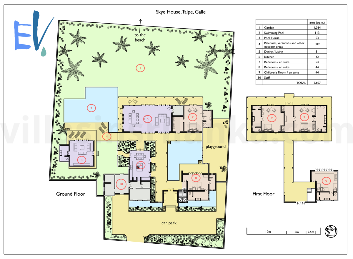 Have just got back from the Skye House after spending 3 weeks in Sri Lanka ( 2 at the Skye house) and one week travelling. It was an amazing place 4 double bedrooms huge! and a room for 6 kids with bunks all with air co and bathrooms. The villa was really beautiful, there were 10 of us ( 2 families) and we had about 9 staff looking after us ( 2 maids, a chef, 3 waiters and 2 security men as well as Janaka the man in charge of the team he was absolutely brilliant!!!!!! We organised through Eden villas and also had a live in nanny during our stay ( extra cost but not expensive and really worth it with little children) Jack Eden was great and the organisation via Eden villas perfect. I can highly recommend this place and would return at the drop of a hat. The pool and garden was right on the beach literally 2 minutes, noone but us went there and the food was incredible. If you haven't already booked then I would recommend you go for this place. VF
