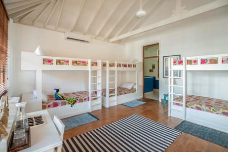 Inside, the villa features four spacious master suites & one colourful six-bed bunk room designed for children. Two master suites are located on the ground floor, one of which includes an additional single bed—perfect for families with a young child. Upstairs are two further master suites, both enjoying ocean views & the sound of the waves as your nightly lullaby. The large bunk room, also on the upper floor, is bright & cheerful, comfortably sleeping six children + a single bed for a 7th child.
