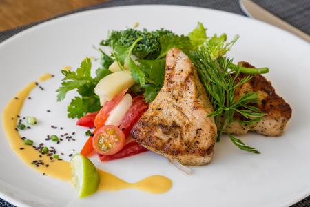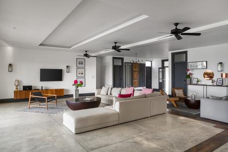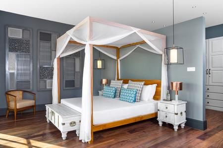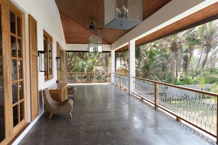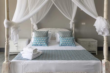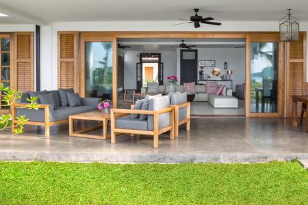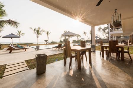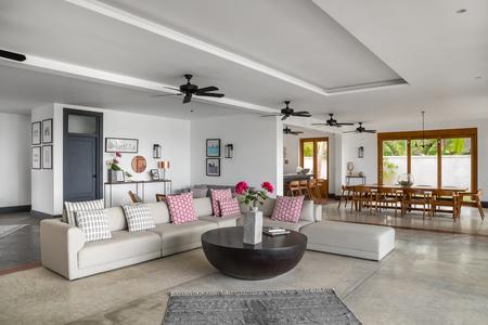 The ground floor is an open plan sitting area with a large L shape sofa and lovely colourful cushions and a dining area with a table for all the family. The chef prepares meals in a kitchen central to both villas and these are served in the house at the table or under the covered veranda overlooking the pool.