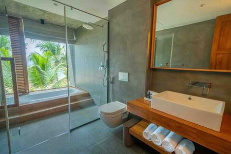There are 5 king size bedroom suites - 4 are master suites all with pool or garden & beach views. Three bathrooms have bath tubs with beach views & one comes with an indoor /outdoor shower.