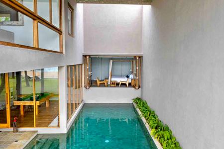 The overall design of this well thought-out villa is sleek minimal with modern facilities. It comes with wheel chair access to the ground floor suite as well as a lift to the upper floors & roof terrace. It’s air conditioned through all internal spaces & cleverly has a separate TV/media room & a pool table / games room. The open plan internal dining sitting + guest kitchen is air conditioned with south facing views through the floor to ceiling windows across the manicured lawn to the beach & out to sea.
