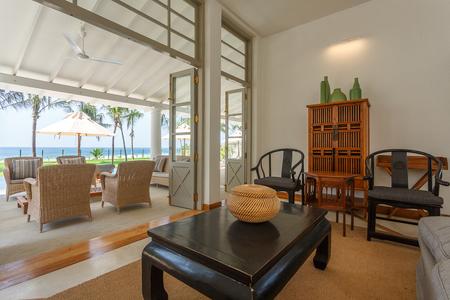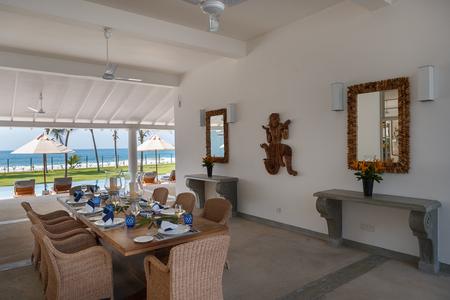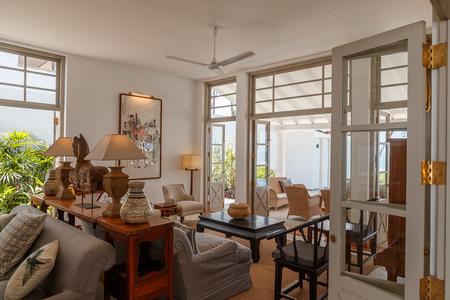 Centred around comfortable communal outdoor spaces. A leafy entrance courtyard draws the eye through the open-air dining ambalama to the ocean. A large, comfortable air-conditioned living room, decorated with antique Chinese furniture, leads onto the covered verandah which overlooks the pool.