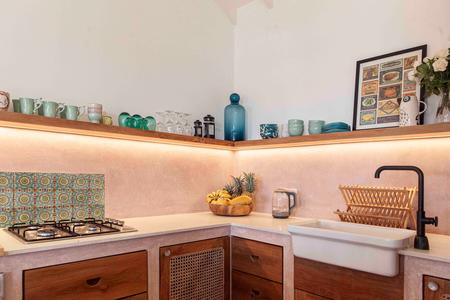 The villa’s interiors boast sleek pink polished concrete floors, blending elegance with laid-back island vibes.