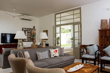 The villa centres around generous communal outdoor spaces. A leafy entrance courtyard, open-air covered dining, and a large comfortable air-conditioned living room.
